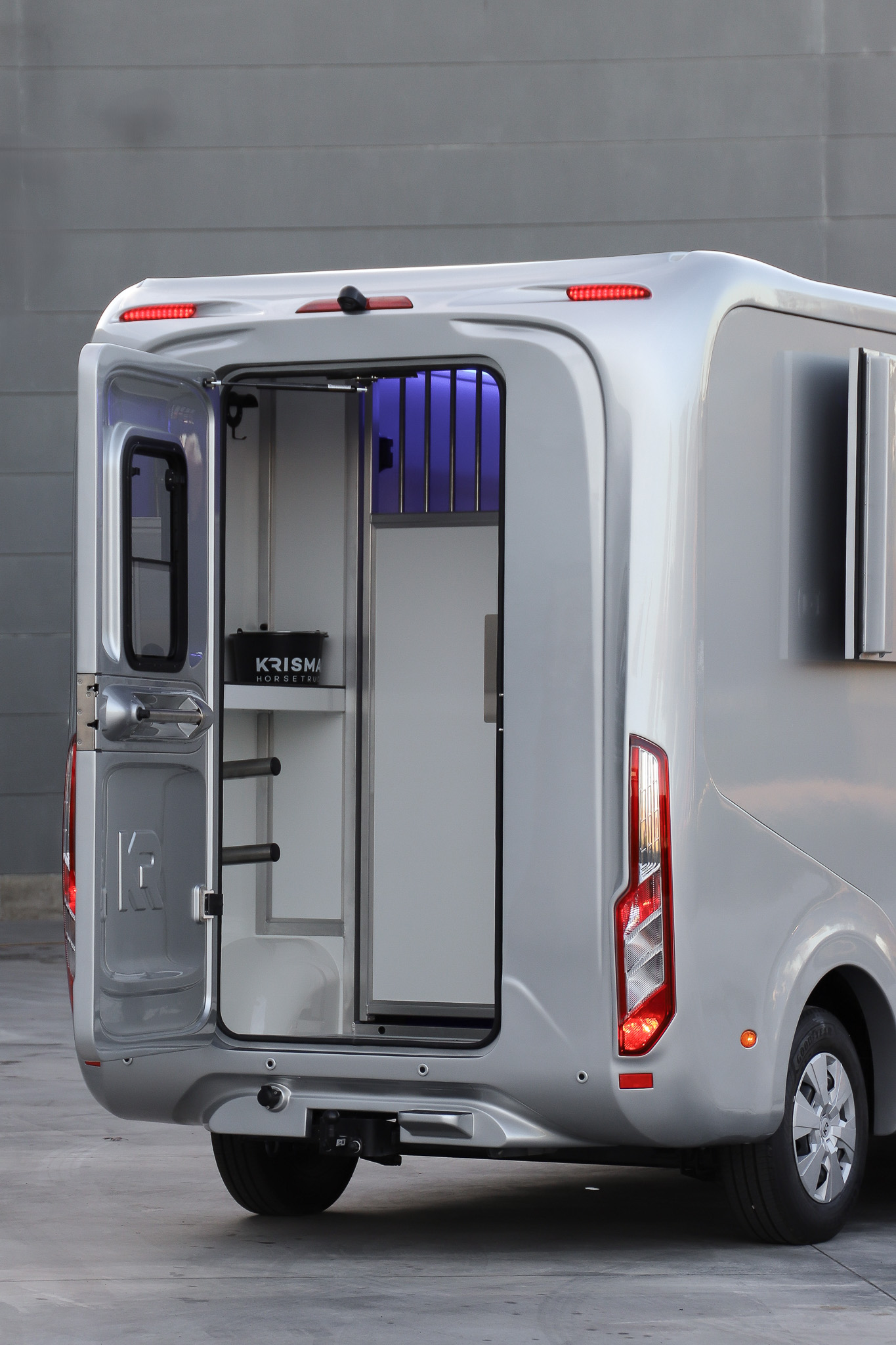 The horse compartment features a stallion layout with a sliding partition that can be moved aside to create one spacious box. The tack area is thoughtfully designed with adjustable saddle racks, bridle holders and shelves to keep all your equestrian equipment organized and accessible.