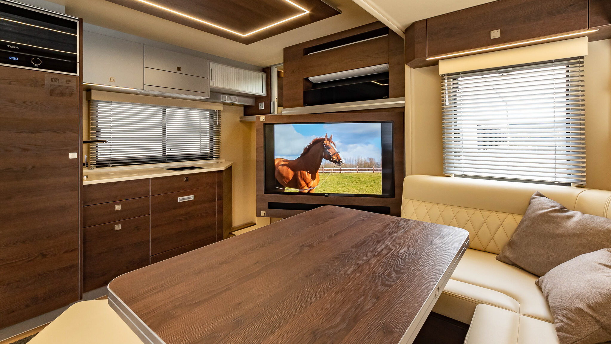 Le résultat ? Un Krismar Exclusive XL, entièrement conçu sur mesure. Du choix du châssis à l’agencement intérieur, en passant par les matériaux et les finitions : chaque détail a été défini en étroite collaboration avec nos ingénieurs. Ce camion chevaux haut de gamme transporte six chevaux en toute sécurité, et offre un espace de vie spacieux et raffiné, pensé pour le confort sur les routes des concours internationaux.